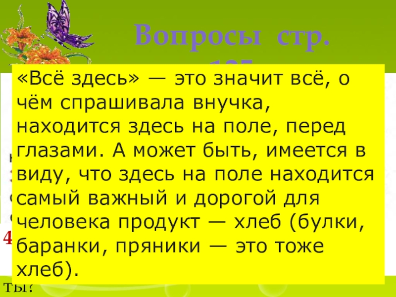 «Всё здесь» — это значит всё, о чём спрашивала внучка, находится здесь на поле, перед глазами. А может быть, имеется в виду, что здесь на поле находится самый важный и дорогой для человека продукт — хлеб (булки, баранки, пряники — это тоже хлеб).