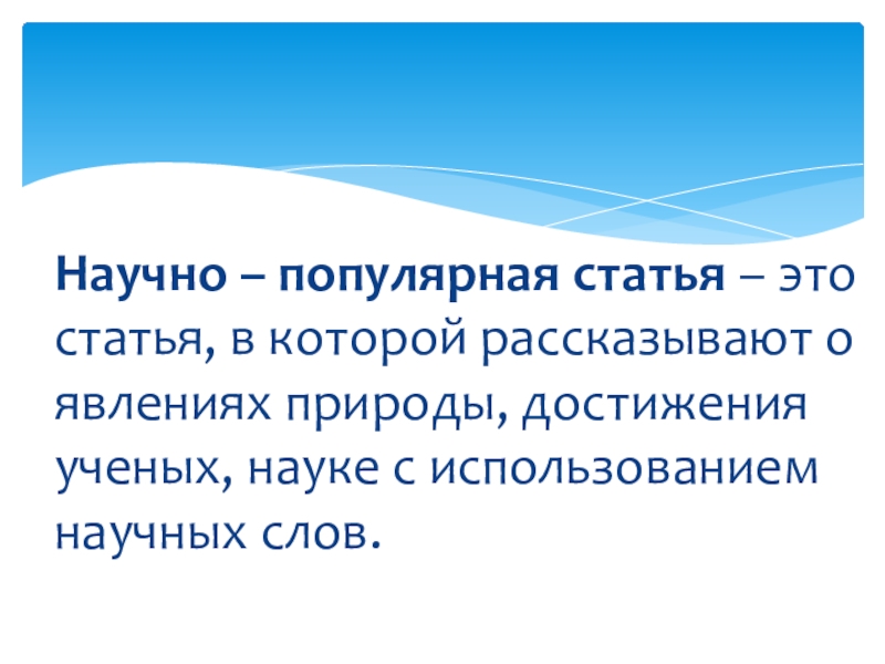 Научно – популярная статья – это статья, в которой рассказывают о явлениях природы, достижения ученых, науке с использованием научных слов.