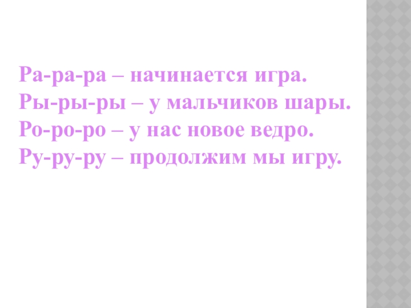Ра-ра-ра – начинается игра.Ры-ры-ры – у мальчиков шары.Ро-ро-ро – у нас новое ведро.Ру-ру-ру – продолжим мы игру.