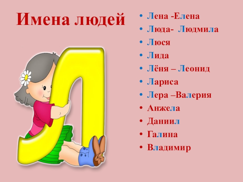 Имена людейЛена -ЕленаЛюда- ЛюдмилаЛюсяЛидаЛёня – ЛеонидЛарисаЛера –ВалерияАнжелаДаниилГалинаВладимир