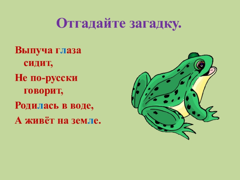 Отгадайте загадку.Выпуча глаза сидит,Не по-русски говорит,Родилась в воде,А живёт на земле.