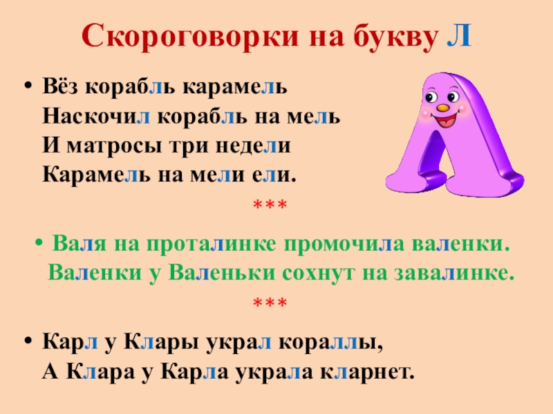 Скороговорки на букву Л Вёз корабль карамель  Наскочил корабль на мель  И матросы три недели  Карамель