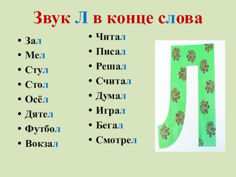 Звук Л в конце словаЗалМелСтулСтолОсёлДятелФутболВокзалЧиталПисалРешалСчиталДумалИгралБегалСмотрел