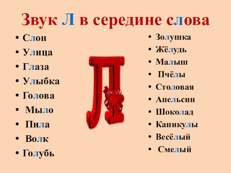 Звук Л в середине словаСлон УлицаГлазаУлыбкаГолова Мыло Пила ВолкГолубь ЗолушкаЖёлудьМалыш ПчёлыСтоловаяАпельсинШоколадКаникулыВесёлый Смелый