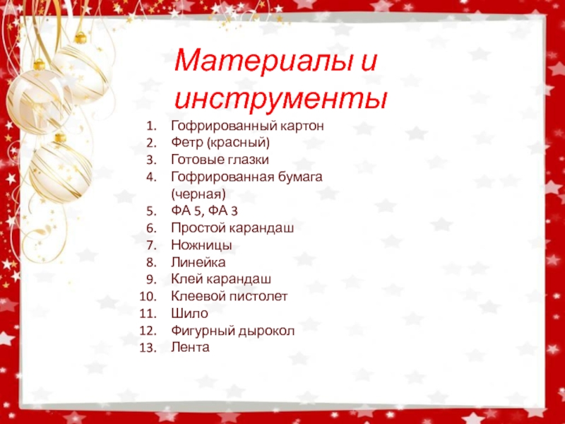 PresentsМатериалы и инструментыГофрированный картонФетр (красный)Готовые глазкиГофрированная бумага (черная)ФА 5, ФА 3Простой карандашНожницы ЛинейкаКлей карандашКлеевой пистолетШило Фигурный дыроколЛента