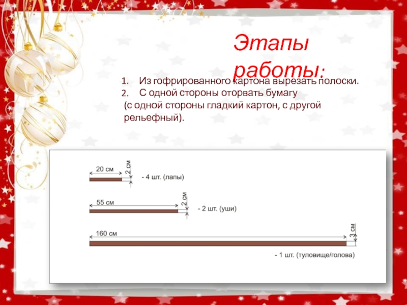 SleighЭтапы работы:Из гофрированного картона вырезать полоски.С одной стороны оторвать бумагу (с одной стороны гладкий картон, с другой