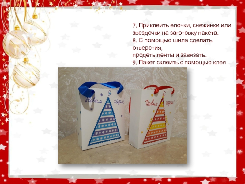 7. Приклеить елочки, снежинки или звездочки на заготовку пакета.8. С помощью шила сделать отверстия,продеть ленты и завязать.9.