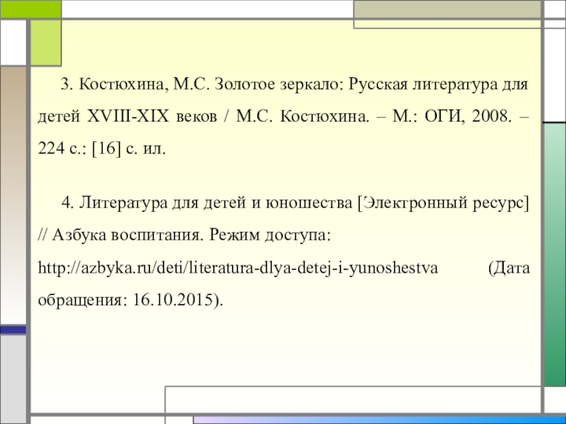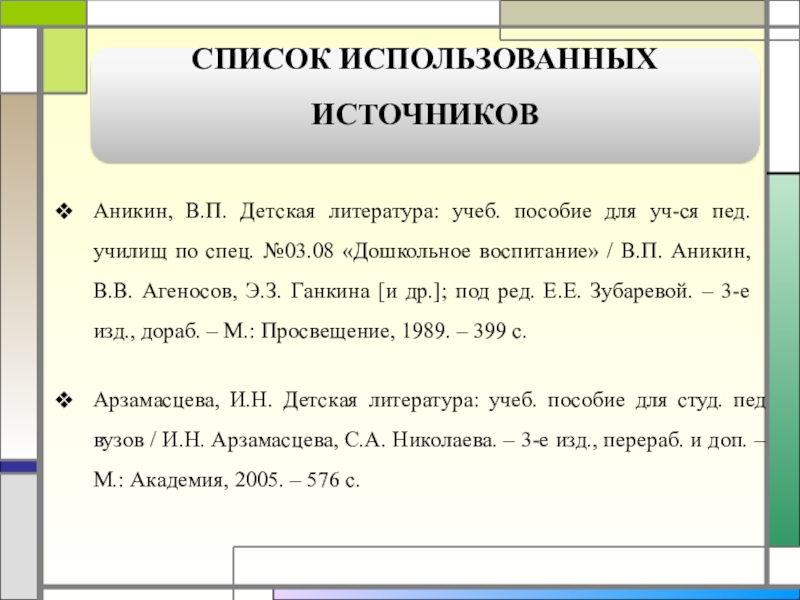 Аникин, В.П. Детская литература: учеб. пособие для уч-ся пед. училищ по спец. №03.08 «Дошкольное воспитание» / В.П. Аникин, В.В. Агеносов, Э.З. Ганкина [и др.]; под ред. Е.Е. Зубаревой. – 3-е изд., дораб. – М.: Просвещение, 1989. – 399 с.