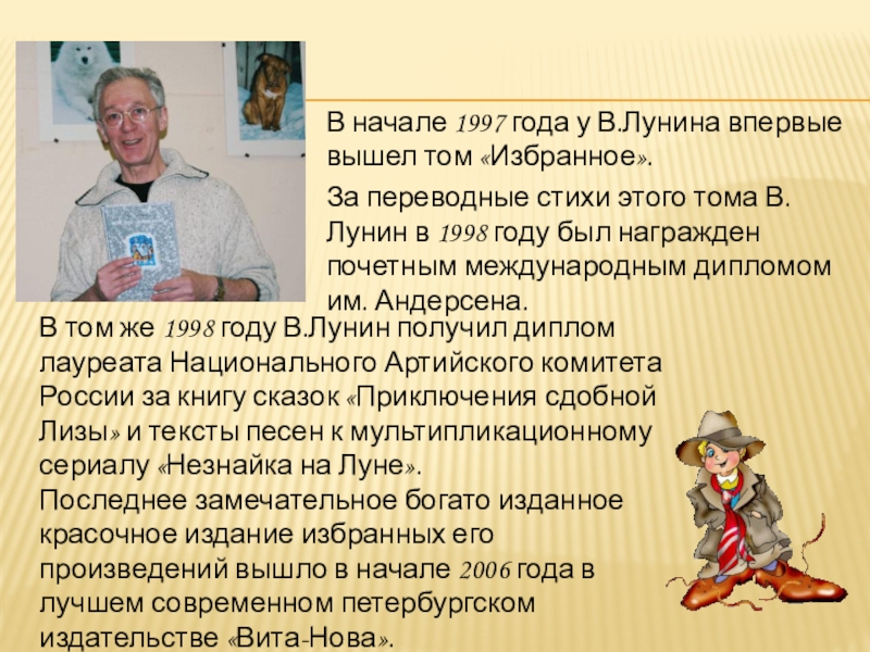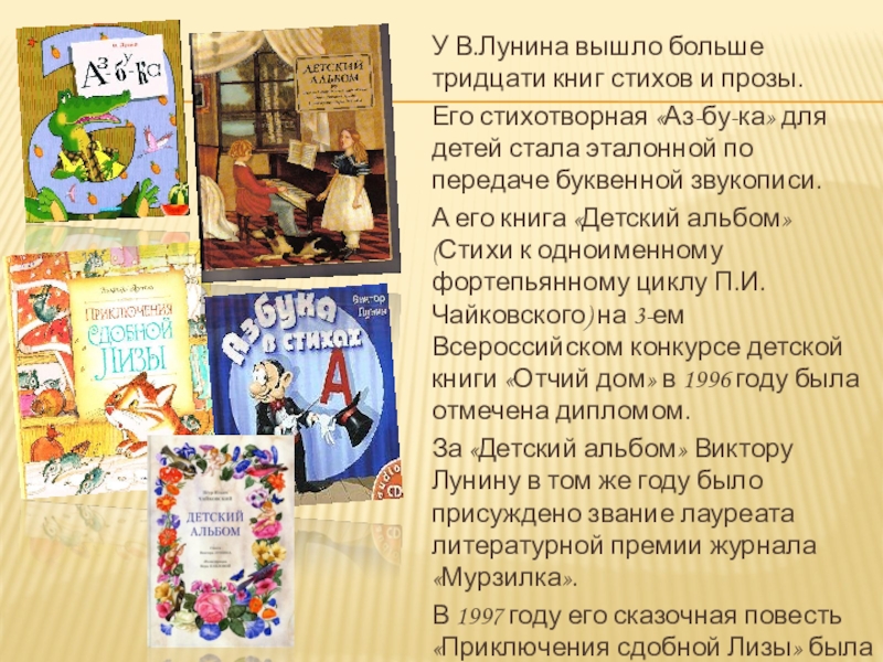 В том же 1998 году В.Лунин получил диплом лауреата Национального Артийского комитета России за книгу сказок «Приключения сдобной Лизы» и тексты песен к мультипликационному сериалу «Незнайка на Луне».