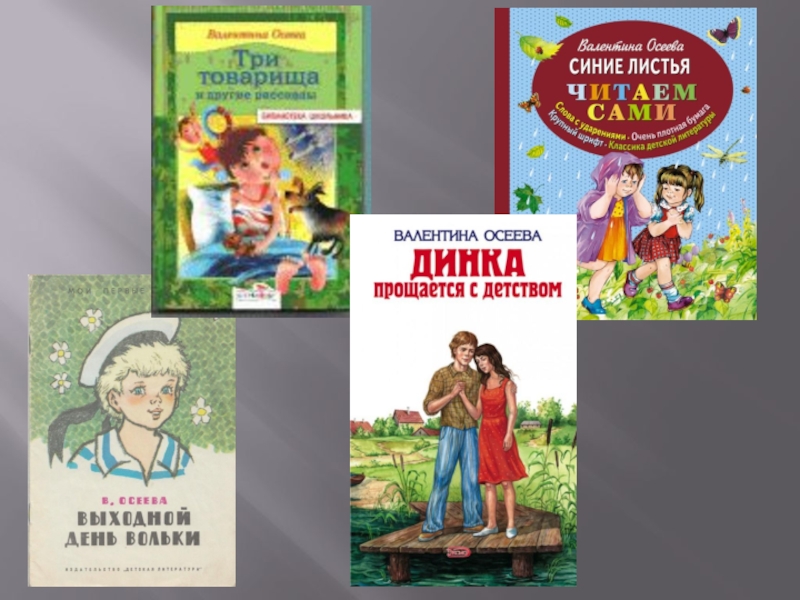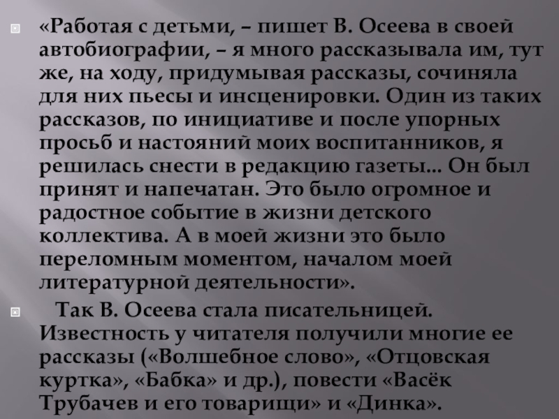 Так В. Осеева стала писательницей. Известность у читателя получили многие ее рассказы («Волшебное слово», «Отцовская куртка», «Бабка» и др.), повести «Васёк Трубачев и его товарищи» и «Динка».