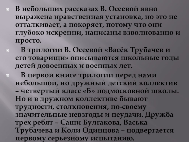 В небольших рассказах В. Осеевой явно выражена нравственная установка, но это не отталкивает, а покоряет, потому что