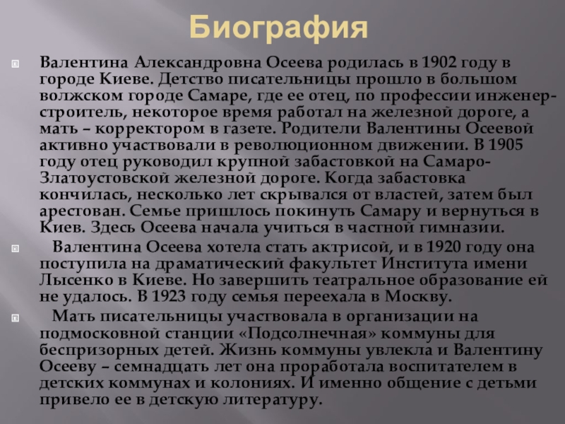БиографияВалентина Александровна Осеева родилась в 1902 году в городе Киеве. Детство писательницы прошло в большом волжском городе Самаре, где ее отец, по профессии инженер-строитель, некоторое время работал на железной дороге, а мать – корректором в газете.