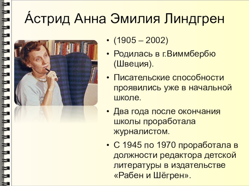 Слайд 3Áстрид Анна Эмилия Линдгрен