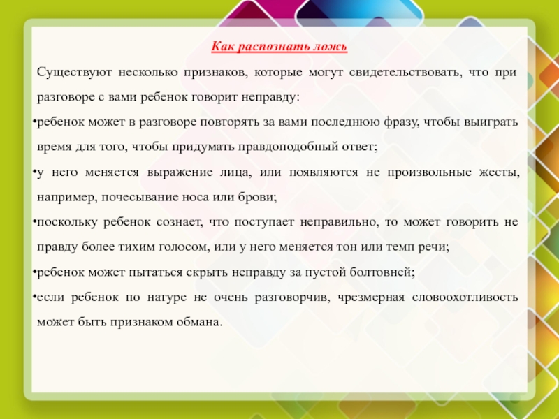 • Дайте ребенку возможность признаться во лжи, не боясь гнева родителей.
