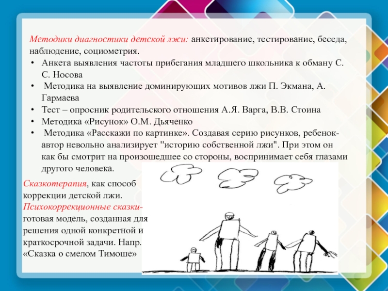Методики диагностики детской лжи: анкетирование, тестирование, беседа, наблюдение, социометрия.
