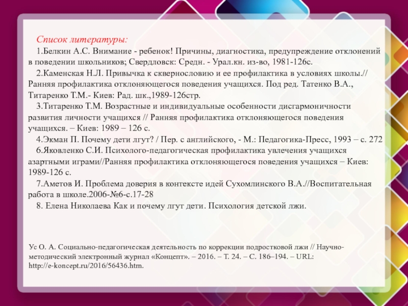 1.Белкин А.С. Внимание - ребенок! Причины, диагностика, предупреждение отклонений в поведении школьников; Свердловск: Средн. - Урал.кн. из-во, 1981-126с.