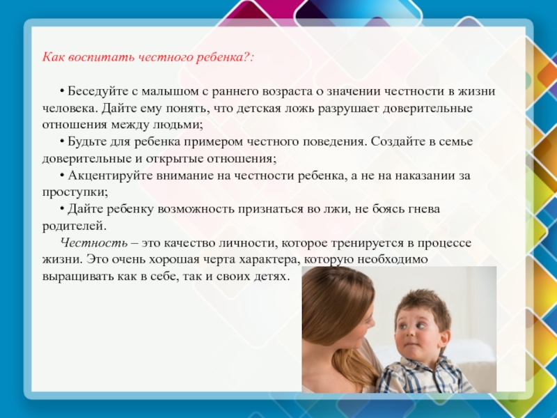 • Будьте для ребенка примером честного поведения. Создайте в семье доверительные и открытые отношения;