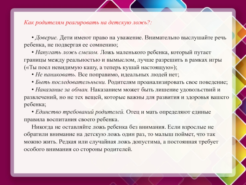 Слайд 10Как родителям реагировать на детскую ложь?:
