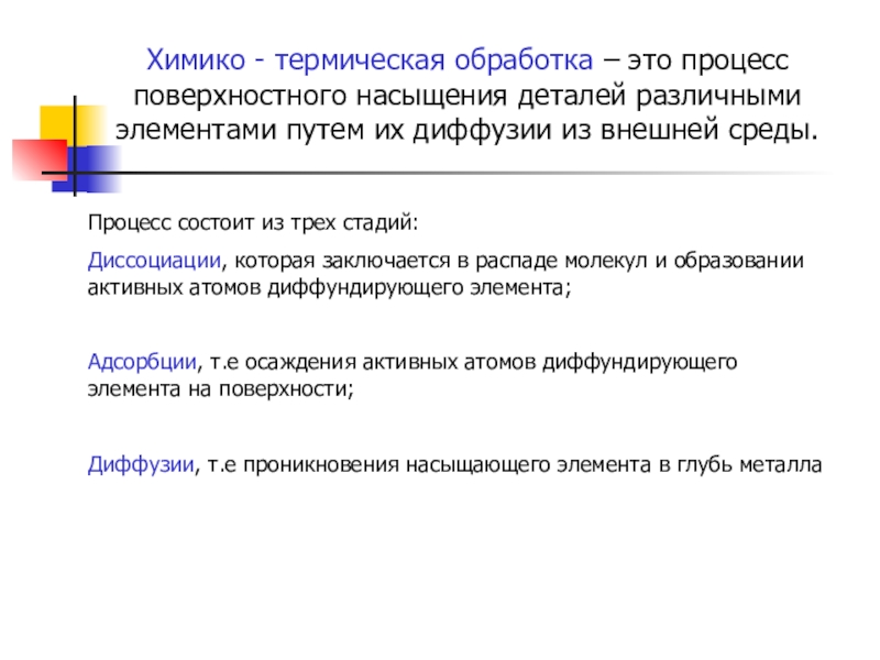 Диссоциации, которая заключается в распаде молекул и образовании активных атомов диффундирующего элемента;