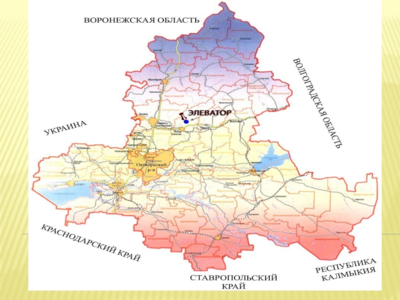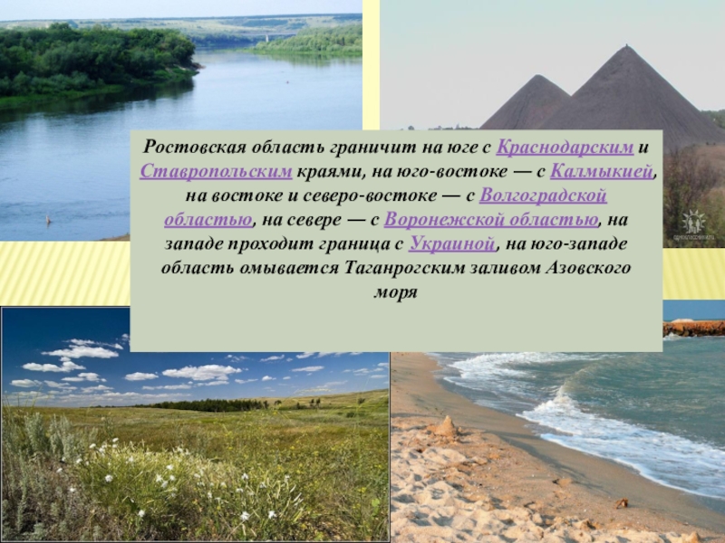 Слайд 2Ростовская область граничит на юге с Краснодарским и Ставропольским краями, на юго-востоке —