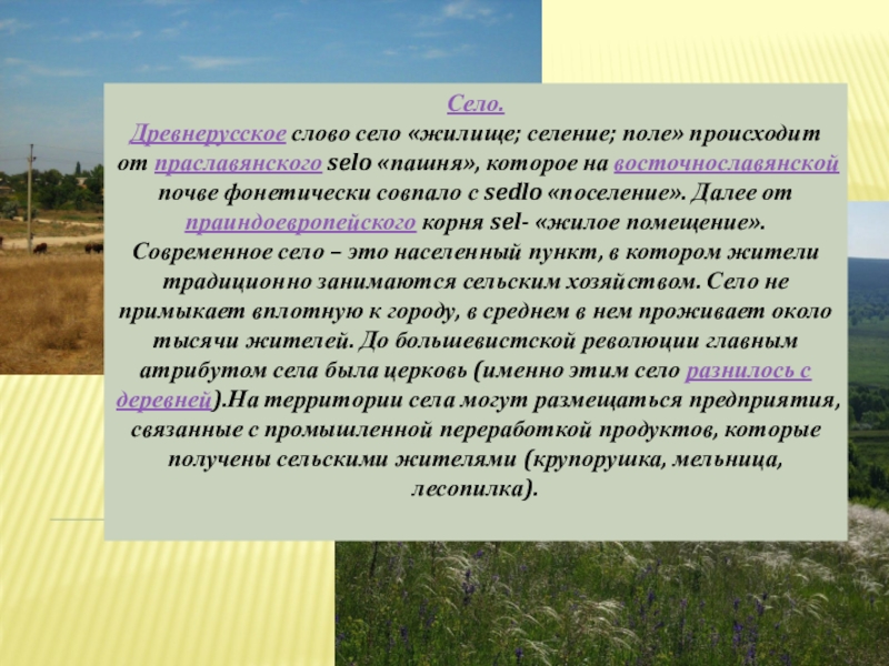 которое на восточнославянской почве фонетически совпало с sedlo «поселение». Далее от праиндоевропейского корня sel- «жилое помещение». Современное село – это населенный пункт, в котором жители традиционно занимаются сельским хозяйством. Село не примыкает вплотную к городу, в среднем в нем проживает около тысячи жителей. До большевистской революции главным атрибутом села была церковь (именно этим село разнилось с деревней).На территории села могут размещаться предприятия, связанные с промышленной переработкой продуктов, которые получены сельскими жителями (крупорушка, мельница, лесопилка).