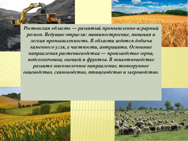 Слайд 6Ростовская область — развитый промышленно-аграрный регион. Ведущие отрасли: машиностроение, пищевая и