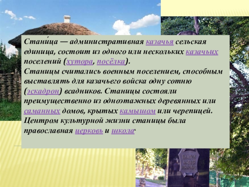 Слайд 9Стани́ца — административная казачья сельская единица, состоит из одного или нескольких казачьих