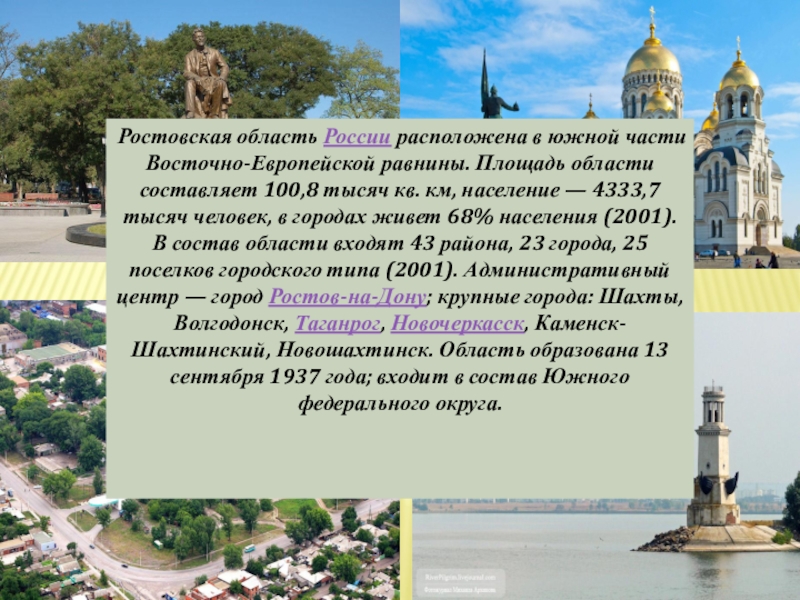 кв. км, население — 4333,7 тысяч человек, в городах живет 68% населения (2001). В состав области входят 43 района, 23 города, 25 поселков городского типа (2001). Административный центр — город Ростов-на-Дону; крупные города: Шахты, Волгодонск, Таганрог, Новочеркасск, Каменск-Шахтинский, Новошахтинск. Область образована 13 сентября 1937 года; входит в состав Южного федерального округа.
