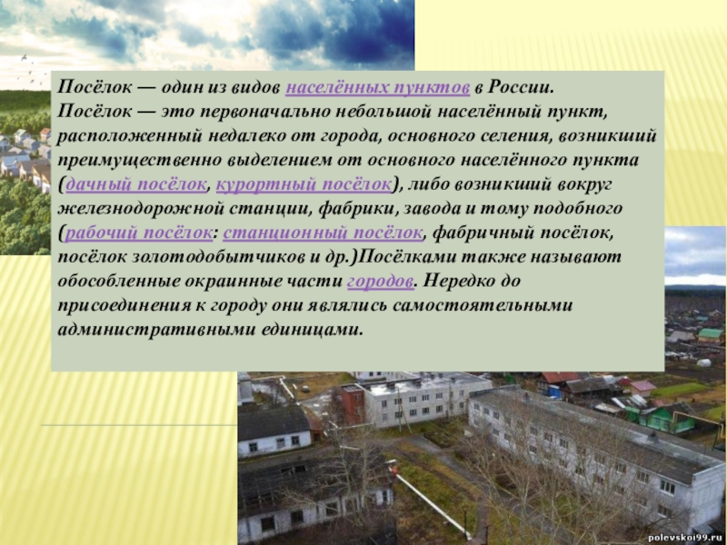 Слайд 11Посёлок — один из видов населённых пунктов в России.