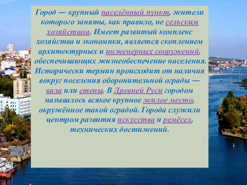 Слайд 8Город — крупный населённый пункт, жители которого заняты, как правило, не сельским