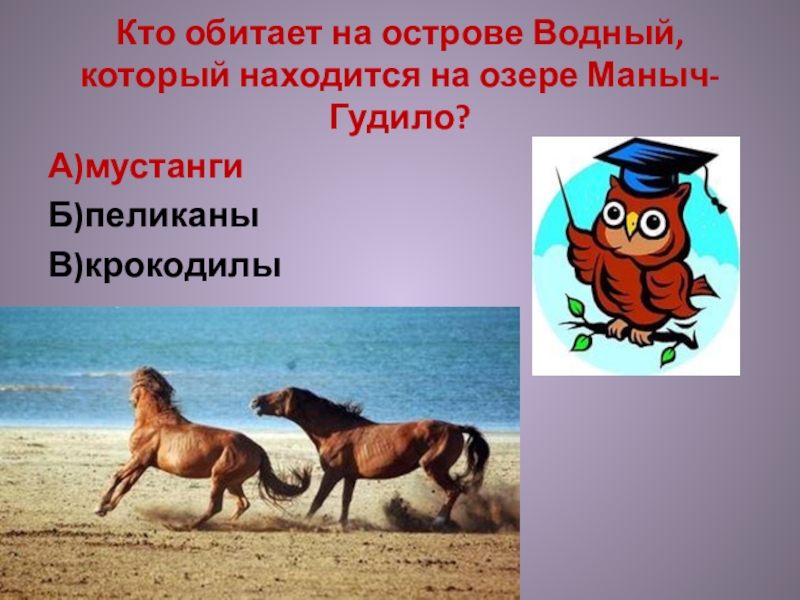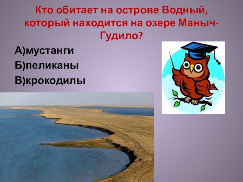 Кто обитает на острове Водный, который находится на озере Маныч-Гудило?А)мустангиБ)пеликаныВ)крокодилы