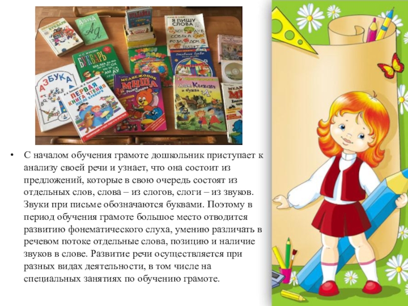 Слайд 5С началом обучения грамоте дошкольник приступает к анализу своей речи и