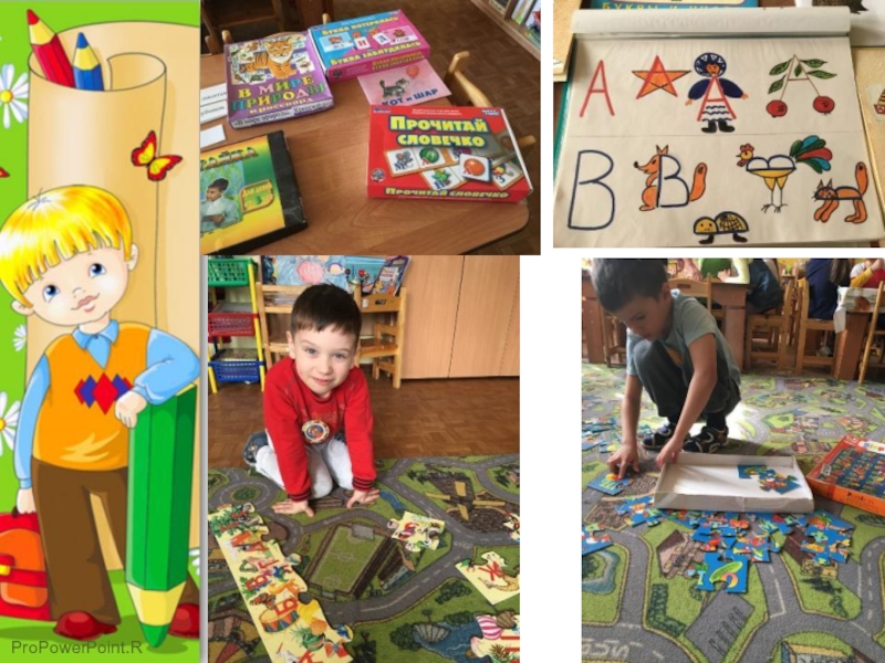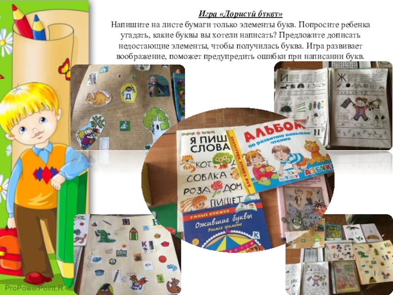 картинках. Задания лучше нарисовать на отдельных листах. Если ребенок не может узнать какую-либо букву, обведите ее тупым концом карандаша, это поможет ему выделить букву на общем фоне.