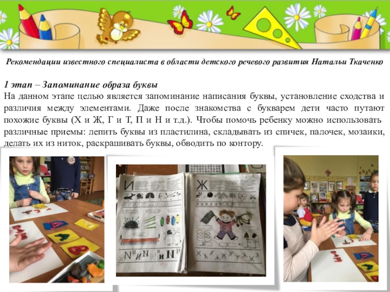 На данном этапе целью является запоминание написания буквы, установление сходства и различия между элементами. Даже после знакомства с букварем дети часто путают похожие буквы (Х и Ж, Г и Т, П и Н и т.д.). Чтобы помочь ребенку можно использовать различные приемы: лепить буквы из пластилина, складывать из спичек, палочек, мозаики, делать их из ниток, раскрашивать буквы, обводить по контору.