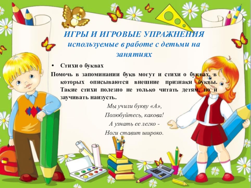 Помочь в запоминании букв могут и стихи о буквах, в которых описываются внешние признаки буквы. Такие стихи полезно не только читать детям, но и заучивать наизусть.
