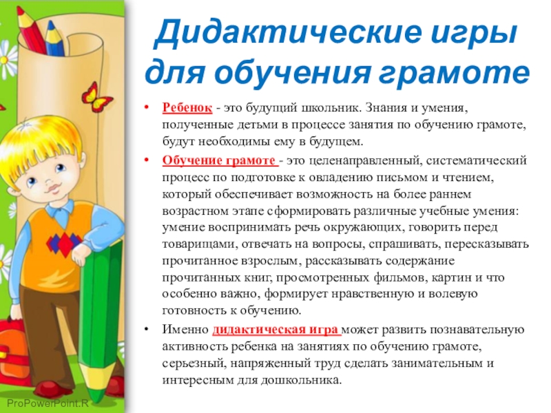 Именно дидактическая игра может развить познавательную активность ребенка на занятиях по обучению грамоте, серьезный, напряженный труд сделать занимательным и интересным для дошкольника.