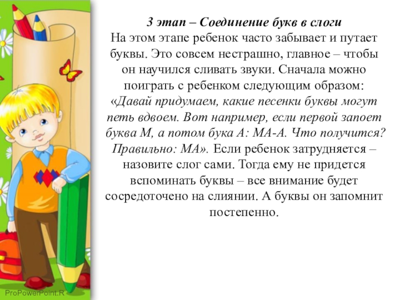 забывает и путает буквы. Это совсем нестрашно, главное – чтобы он научился сливать звуки. Сначала можно поиграть с ребенком следующим образом: «Давай придумаем, какие песенки буквы могут петь вдвоем. Вот например, если первой запоет буква М, а потом бука А: МА-А. Что получится? Правильно: МА». Если ребенок затрудняется – назовите слог сами. Тогда ему не придется вспоминать буквы – все внимание будет сосредоточено на слиянии. А буквы он запомнит постепенно.