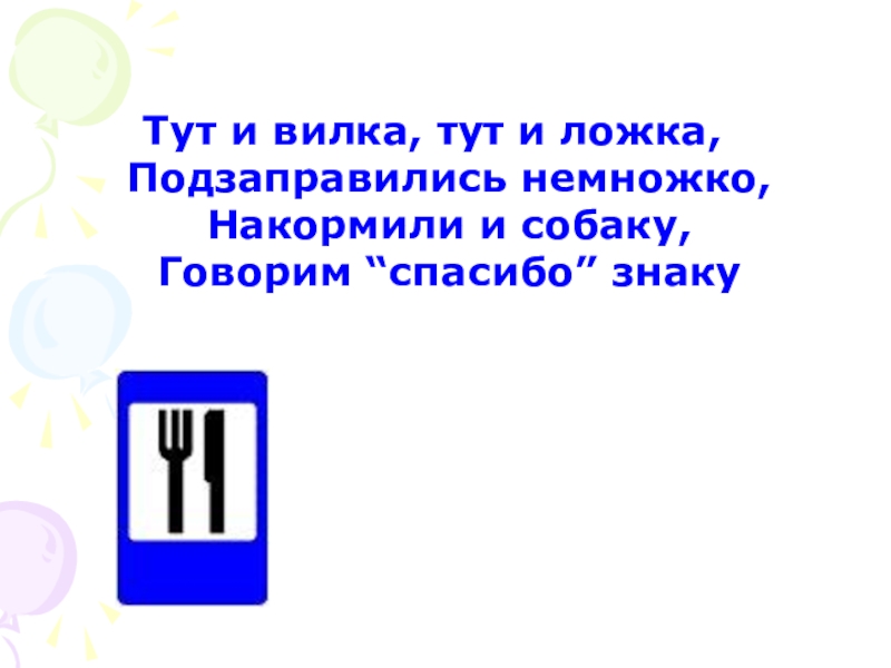 Слайд 9Тут и вилка, тут и ложка, Подзаправились немножко, Накормили и собаку, Говорим “спасибо” знаку