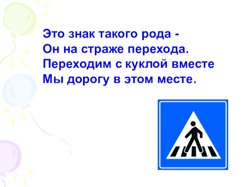 Это знак такого рода - Он на страже перехода.  Переходим с куклой вместе Мы дорогу в