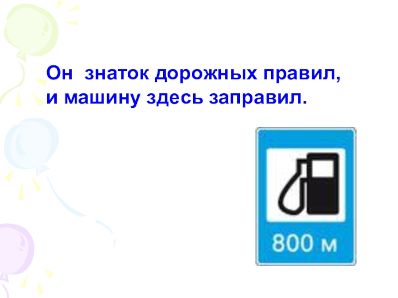 Слайд 10Он знаток дорожных правил, и машину здесь заправил.