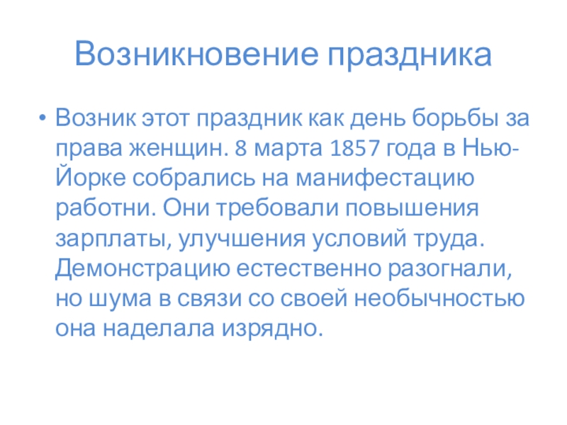 Возникновение праздникаВозник этот праздник как день борьбы за права женщин. 8 марта 1857 года в Нью-Йорке собрались на манифестацию работни. Они требовали повышения зарплаты, улучшения условий труда. Демонстрацию естественно разогнали, но шума в связи со своей