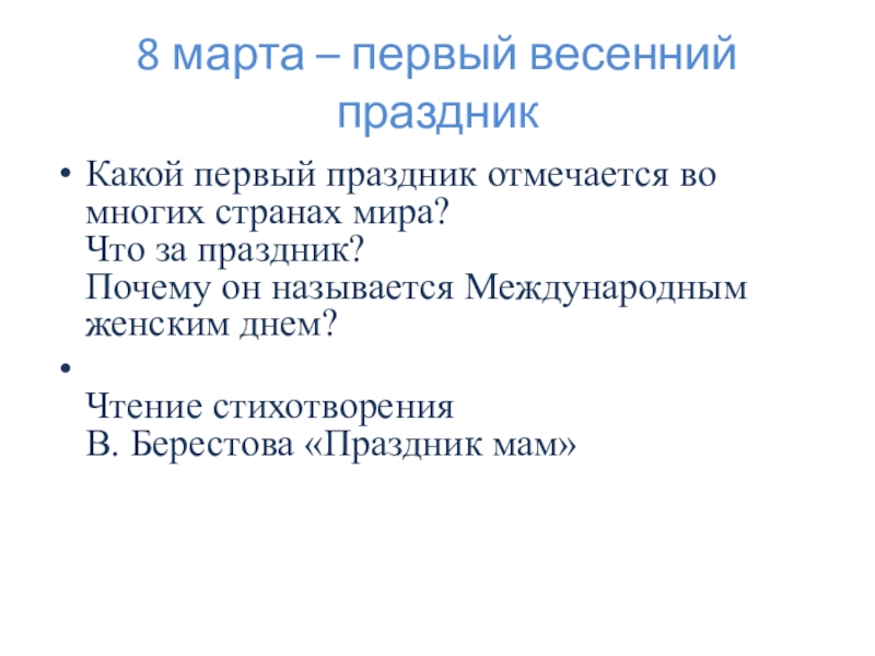 8 марта – первый весенний праздникКакой первый праздник отмечается во многих странах мира? Что за праздник? Почему
