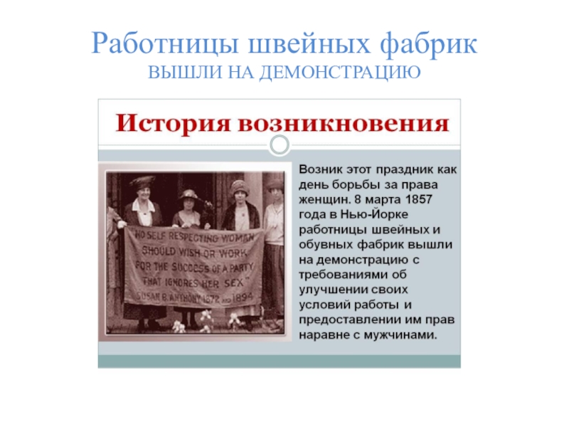 Возникновение праздникаВозник этот праздник как день борьбы за права женщин. 8 марта 1857 года в Нью-Йорке собрались