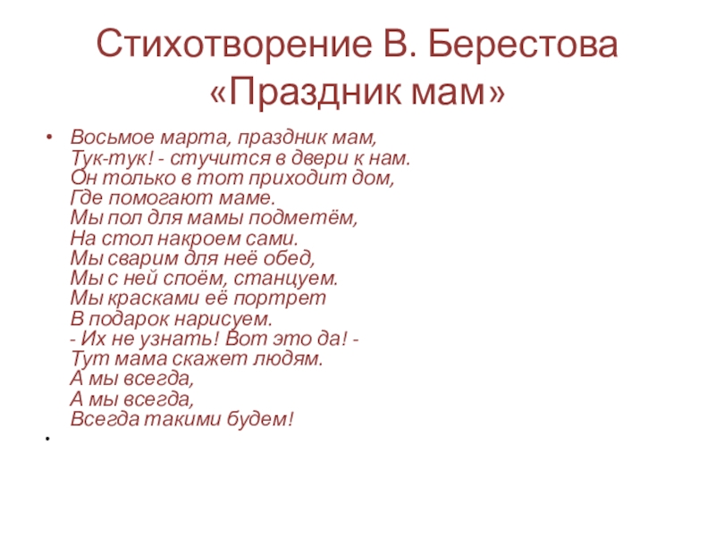 Стихотворение В. Берестова «Праздник мам»Восьмое марта, праздник мам, Тук-тук! - стучится в двери к нам. Он только