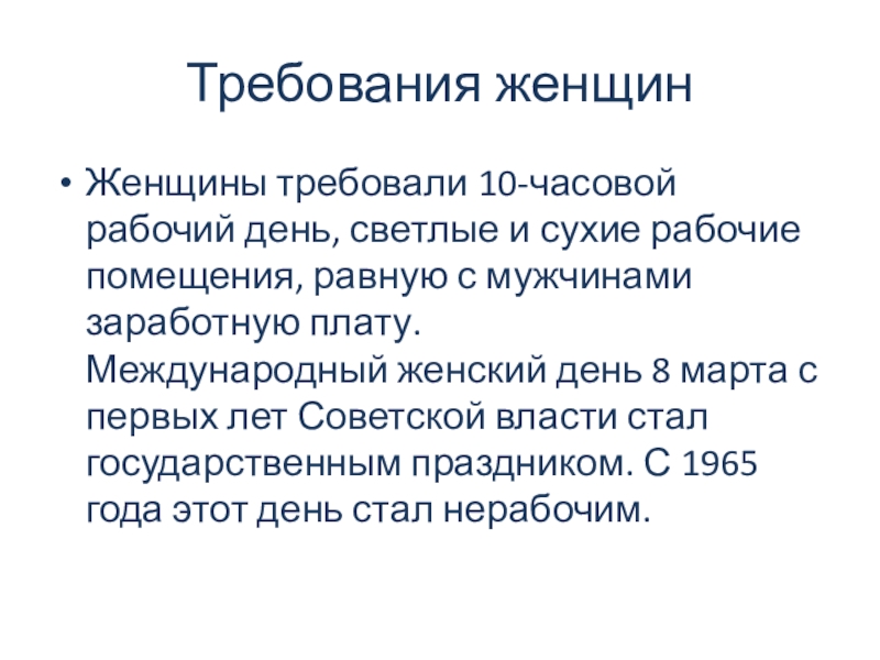 Требования женщинЖенщины требовали 10-часовой рабочий день, светлые и сухие рабочие помещения, равную с мужчинами заработную плату. Международный