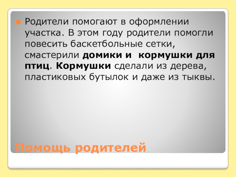 Помощь родителейРодители помогают в оформлении участка. В этом году родители помогли повесить баскетбольные сетки, смастерили домики и