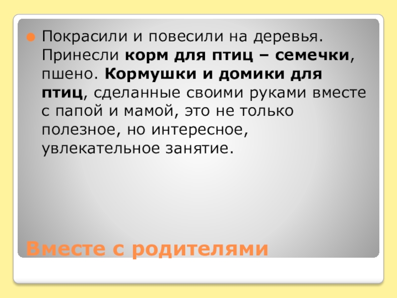 Вместе с родителямиПокрасили и повесили на деревья. Принесли корм для птиц – семечки, пшено. Кормушки и домики для