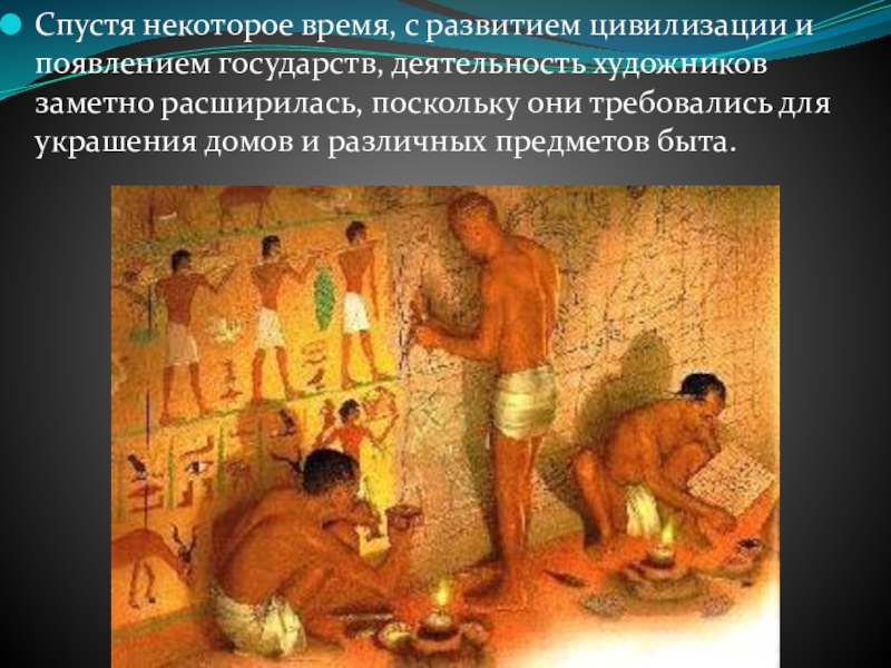 Слайд 8Спустя некоторое время, с развитием цивилизации и появлением государств, деятельность художников