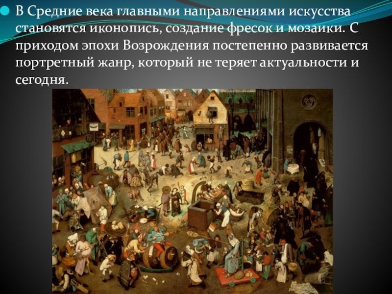 Слайд 10В Средние века главными направлениями искусства становятся иконопись, создание фресок и
