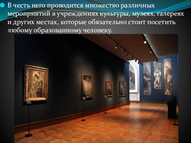 Слайд 5В честь него проводится множество различных мероприятий в учреждениях культуры, музеях,